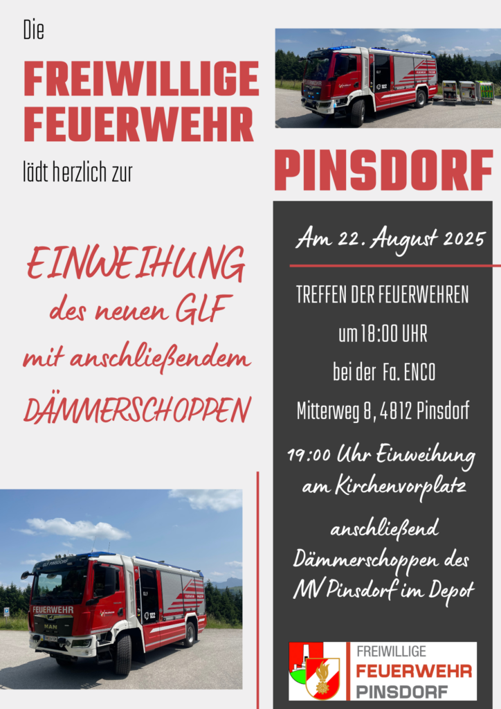Die Freiwillige Feuerwehr Pinsdorf freut sich, alle Bürgerinnen und Bürger sowie Feuerwehren herzlich zur feierlichen Einweihung unseres neuen Großlöschfahrzeuges (GLF) einzuladen. Dieses besondere Ereignis wollen wir gemeinsam mit Ihnen feiern – mit Musik und Geselligkeit im Zuge des Pinsdorfer Dorffestes.